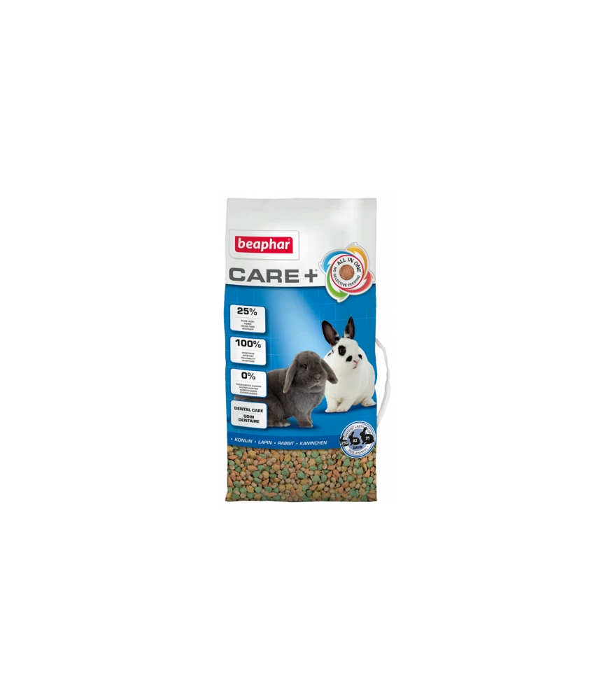 Beaphar CARE+® Konijn heeft een hoog vezelgehalte (25%) voor een goede gezondheid en een optimale spijsvertering. Ieder brokje heeft dezelfde samenstelling (All-in-One) wat belangrijk is voor een uitgebalanceerde voeding (geen selectief eetgedrag en restjes meer). De hardere geëxtrudeerde brokjes bevorderen de slijtage van de tanden (Dental Care). CARE+® bevat: • Groene thee extract dat het immuunsysteem stimuleert en ondersteunt • Echinacea • Spirulina • Vitamine E • Yucca Schidigera • gecheleerde mineralen voor een betere mineralenopname • FOS en MOS voor een goede ondersteuning van de darmflora • Omega 3 en lling (All-in-One) wat belangrijk is voor een uitgebalanceerde voeding (geen selectief eetgedrag en restjes meer). De hardere geëxtrudeerde brokjes bevorderen de slijtage van de tanden (Dental Care).