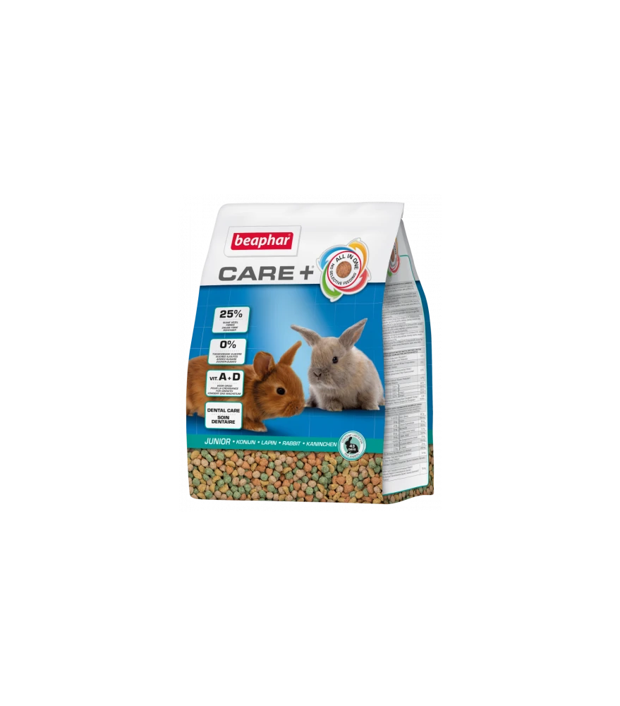 Beaphar CARE+® Konijn Junior heeft een hoog vezelgehalte (25%) voor een goede gezondheid en een optimale spijsvertering. Ieder brokje heeft dezelfde samenstelling (All-in-One) wat belangrijk is voor een uitgebalanceerde voeding (geen selectief eetgedrag en restjes meer). De hardere geëxtrudeerde brokjes bevorderen de slijtage van de tanden (Dental Care). De brokjes zijn kleiner van formaat en bevatten calcium dat belangrijk is voor bot- en spiergroei. Vitamine A en D ondersteunen een gezonde groei.