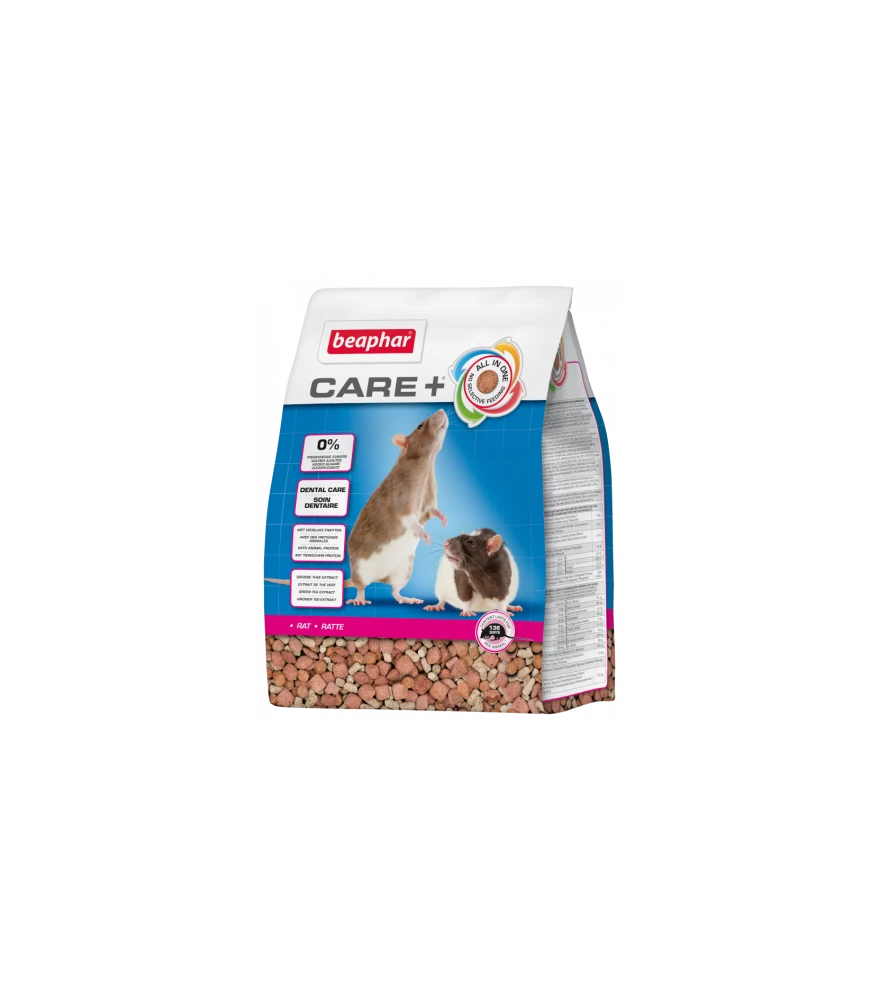 Beaphar CARE+® Rat bevat dierlijke eiwitten en is stofarm om de gevoelige luchtwegen van ratten te ontzien. Ieder brokje heeft dezelfde samenstelling (All-in-One) wat belangrijk is voor een uitgebalanceerde voeding (geen selectief eetgedrag en restjes meer). De hardere geëxtrudeerde brokjes bevorderen de slijtage van de tanden (Dental Care).