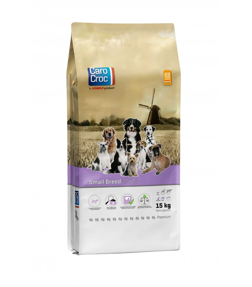 De brokken van CaroCroc Small Breed zijn specifiek samengesteld om kleine rassen te ondersteunen waar nodig. Zo stimuleren de brokken de vetafbraak, voorkomen ze tandplak en gaan ze celveroudering tegen.