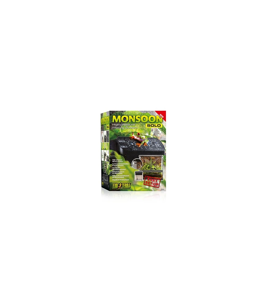 De Exo Terra Monsoon SOLO is een programmeerbaar nevelsysteem voor elk type terrarium en plantenkas. Het helpt een optimale luchtvochtigheid te handhaven door te beregenen met vooraf geprogrammeerde tussenpozen. De duur en de frequentie kunnen eenvoudig ingesteld worden, afhankelijk van het soort dier of plant dat men houdt. Regelmatige neerslag bevordert het broedgedrag, en is noodzakelijk wanneer levende tropische planten, zoals bromelia’s, orchideeën, mossen e.d. als decoratie dienen.