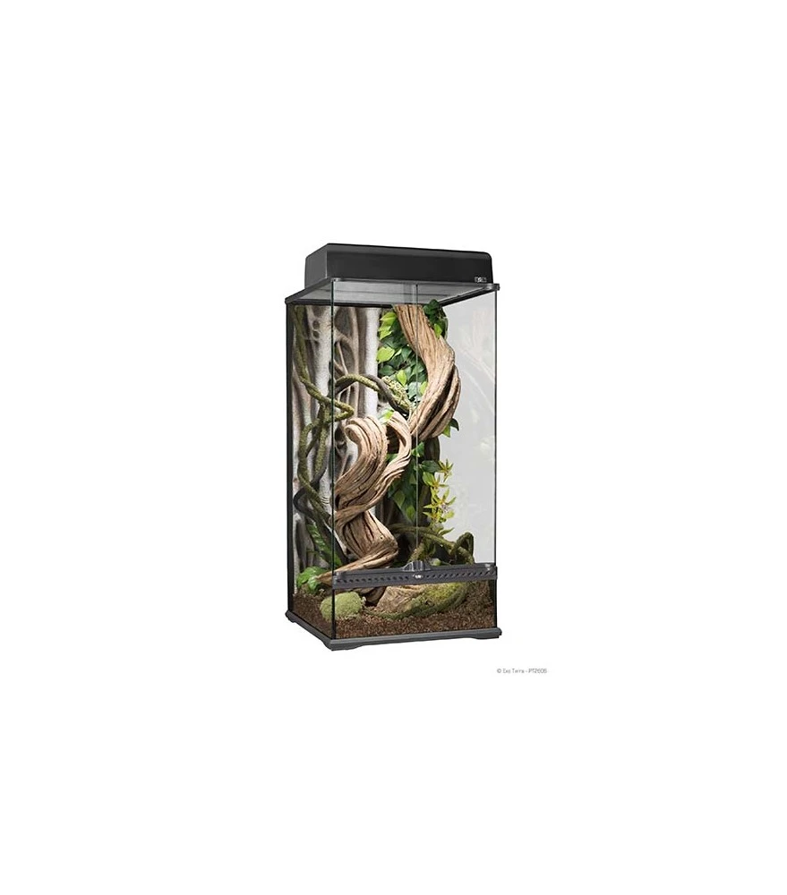 Dit nieuwe type extra hoog Exo Terra glazen terrarium is ideaal voor boombewonende reptielen- en amfibieënsoorten. De unieke achtergrond met wortelmotief maakt er een geweldig habitat van voor een groot aantal boombewonende soorten zoals boomboa’s en pythons, daggekko’s, bladstaartgekko’s, tokehs, boomkikkers enz. Het heeft alle andere goede kenmerken van de Exo Terra glazen terrariums; Het Exo Terra glasterrarium is de ideale behuizing voor reptielen en amfibieën ontworpen door Europese herpetologen. De vooraan openende deuren vergemakkelijken het voeren en onderhoud. Een speciaal ontworpen sluiting voorkomt ontsnappen en de deuren kunnen afzonderlijk geopend worden.