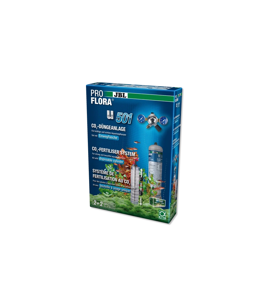 - Inhoud: ProFlora u501, incl. 500g CO2-wegwerpfles, armatuur, drukregelaar, JBL Taifun reactor, bellenteller, 3m speciale slang, terugloopzekering, CO2/ pH-permanenttest, 2x vloeibare meststof à 100 ml, 1x JBL dagelijkse meststof.