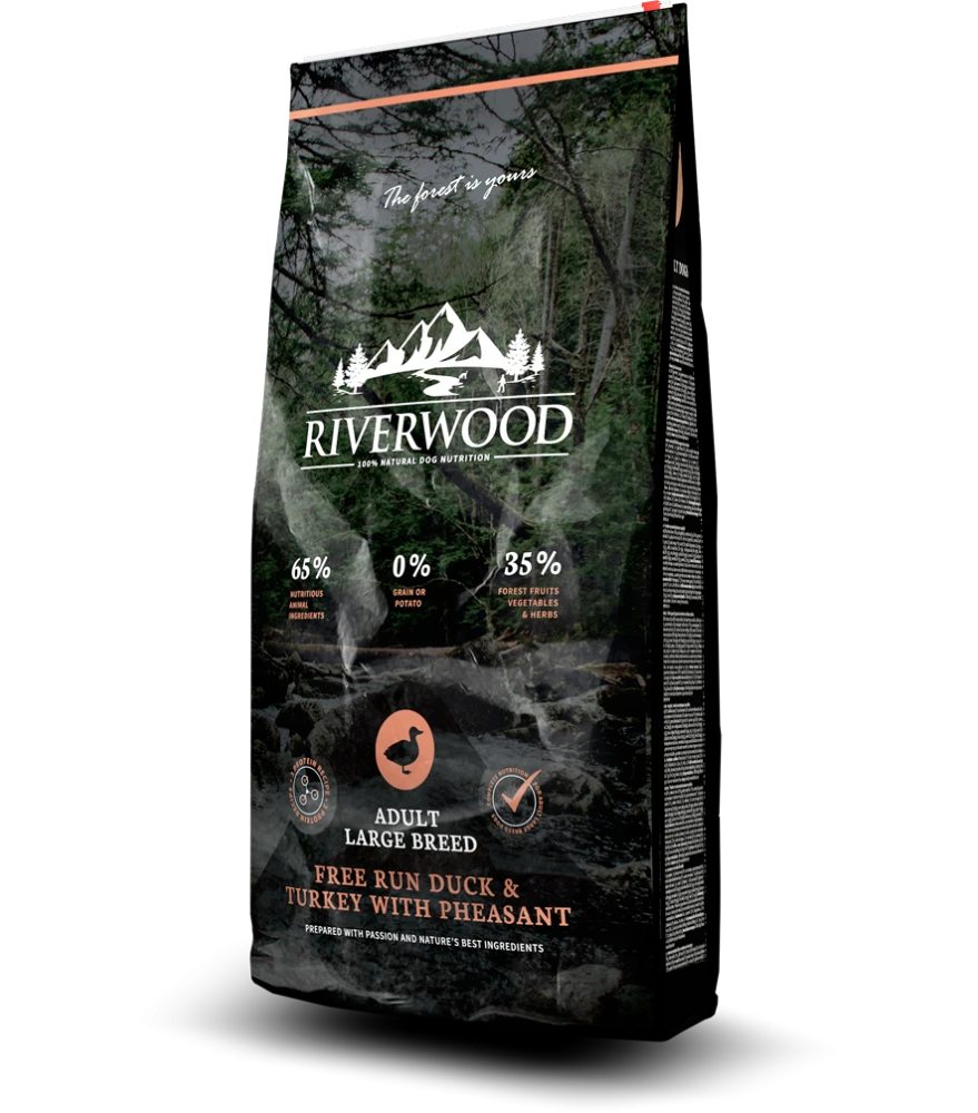 Riverwood Adult Large Breed Duck & Turkey is speciaal ontwikkeld voor volwassen honden vanaf 12 maanden van grotere rassen. Uitgebalanceerde voeding met drie diersoorten als eiwitbron en bovendien is er geen gebruik gemaakt van graan, rijst of aardappelzetmeel. Riverwood Adult Large Breed Duck & Turkey 12 kg is daarentegen gebouwd op de kracht van gele erwten, een nieuwe manier welke nog niet veel gebruikt wordt. Verder bevat het product veel functionele voedingsstoffen die de immuniteit ondersteunen. Ook zorgt het voor een ondersteunende werking op de spijsvertering.