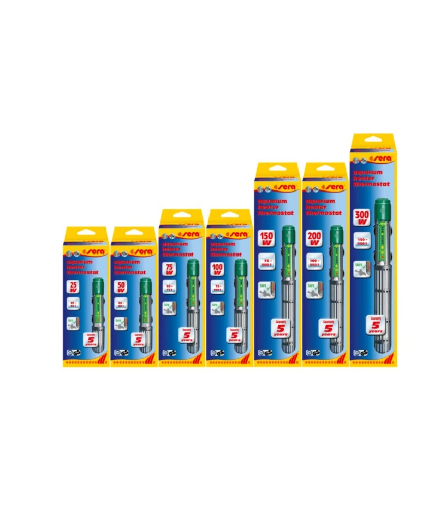 De sera aquarium-regelverwarmers zijn zeer kort en passen gemakkelijk in de kleinste aquariums. De bedrijfsindicatie (aan/uit) vindt plaats door een glimlamp.